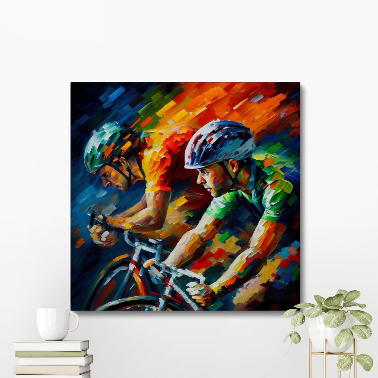 Whether you’re a cycling enthusiast or simply appreciate beautiful art, this canvas print is sure to impress. The image of two cyclists racing together is both captivating and inspiring, making it the perfect gift for anyone in your life who loves cycling.