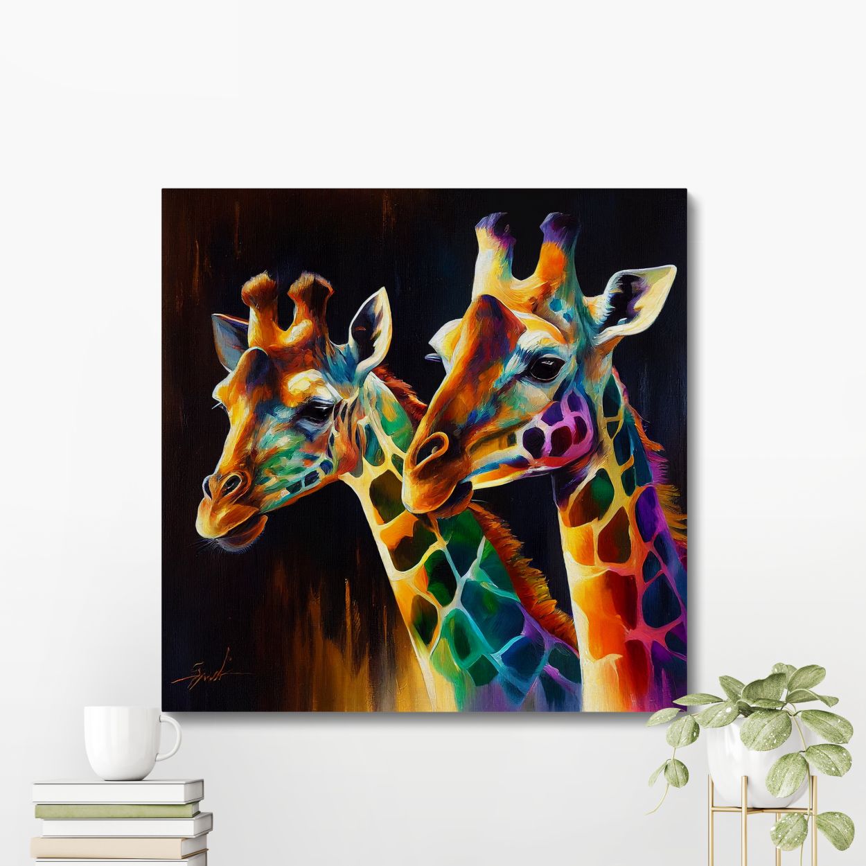 Whether you’re an animal lover or simply appreciate beautiful art, this canvas print is sure to impress. The image of two giraffes standing together is both captivating and inspiring, making it the perfect gift for anyone in your life.