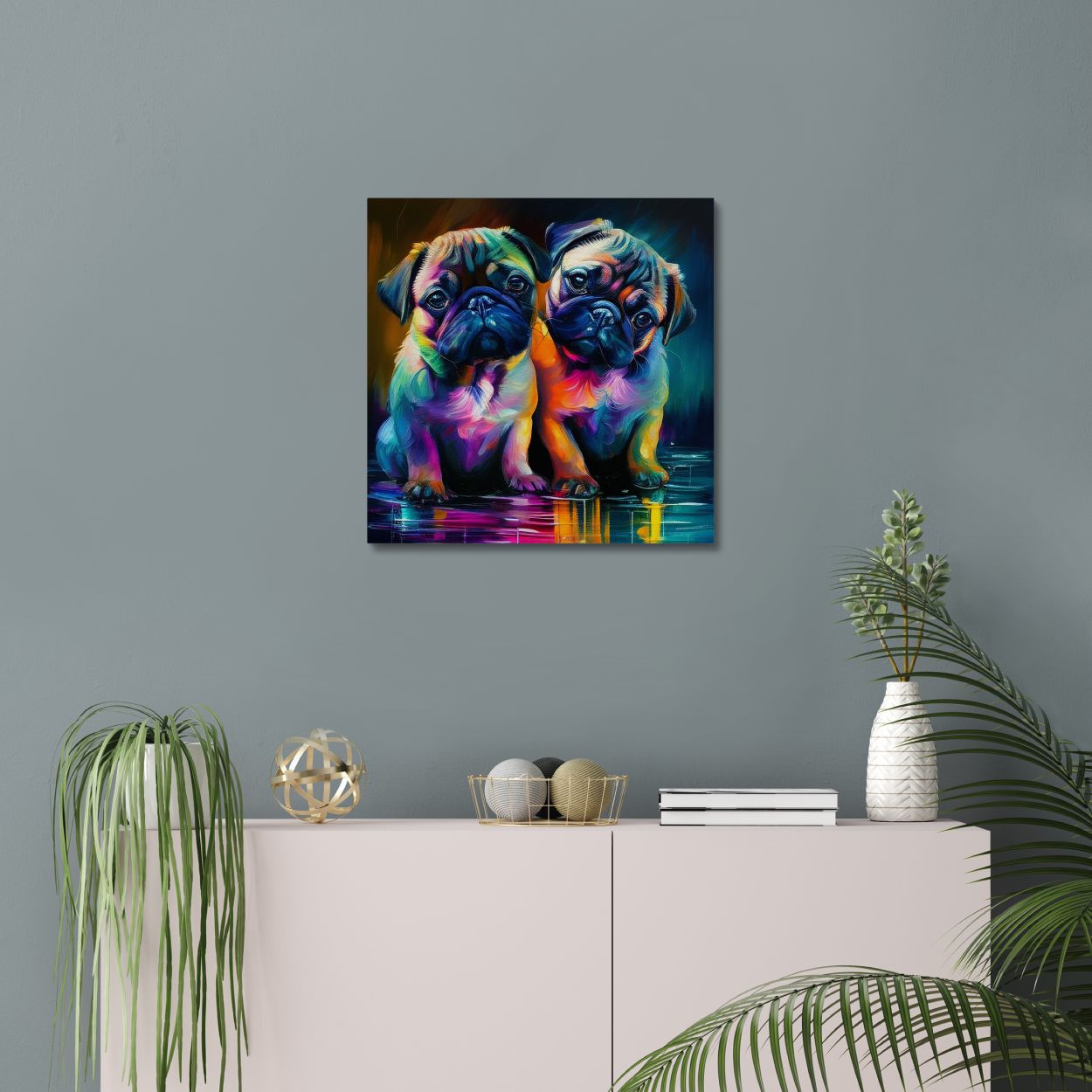 Introducing our modern canvas print of Two Pugs, the perfect addition to any home or office space. This adorable piece of wall art is printed on high-quality canvas, ensuring its longevity and vibrancy. The charming combination of two pugs adds a playful touch to any room, bringing joy and cuteness indoors.