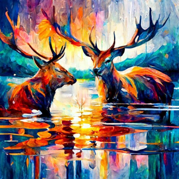 The two stags in water are depicted in all their glory, with their antlers and piercing gaze captured in stunning detail. The use of complementary colours adds depth and texture to the image, making it a true masterpiece.