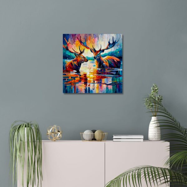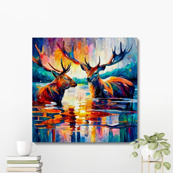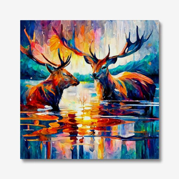 Introducing our modern canvas print of two stags in water , a stunning addition to any home decor. The canvas print features a visually striking background in shades of blue, yellow, and orange, creating a perfect complement to the image of the stags.